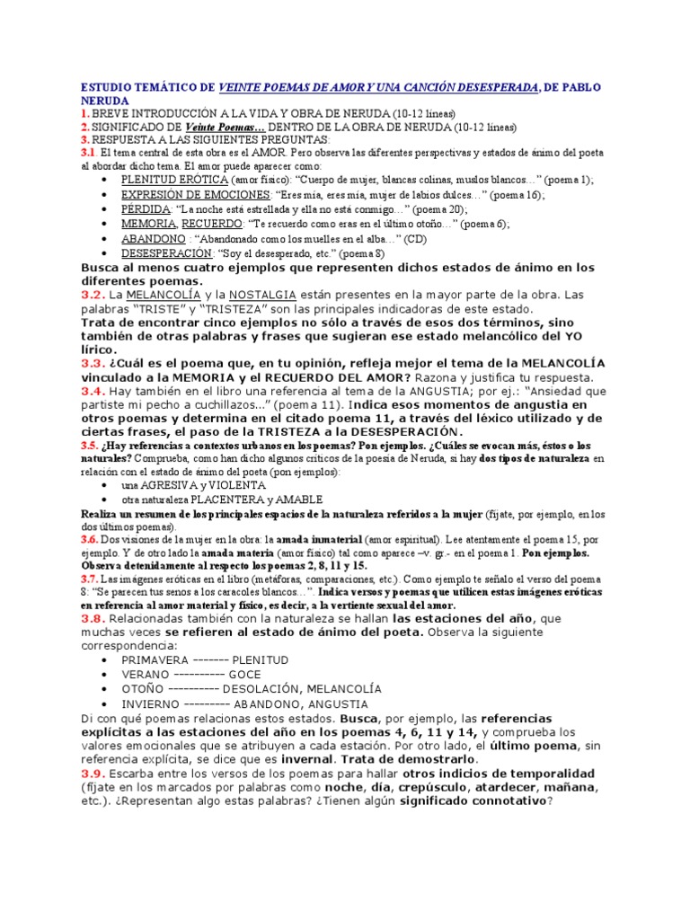 Todos los poemas y la canción fueron escritos por el poeta chilena pablo neruda. Este concepto se encuentra formado por dos términos que en sí mismos encierran sentido individual y auténtico. Un análisis consiste en separar las partes del todo, para volver a unirlas; El libro est compuesto de veinte poemas de temtica amorosa y un poema final la cancin desesperada. ¿ que se dice de la naturaleza respecto al servicio? Se singularizan estas canciones de gesta por su carácter evolutivo, pues ellas han sufrido. Expone la evolución del ser humano (el personaje en cuestión) desde el punto de vista de la teoría de sigmund freud. Existen análisis literarios de diversas clases, distintos abordajes de una obra desde variadas disciplinas y corrientes ideológicas: Desde un punto de vista académico literario, conocer los pasos a seguir para saber cómo analizar todos ellos suelen coincidir en un punto: Análisis literario de poema xx. Abril 2012 índice introducción pablo neruda gran escritor y poeta en. En el mismo sentido, fondo o contenido, se refiere a elementos como: En la infancia, se sabe distinto a los demás niños.
